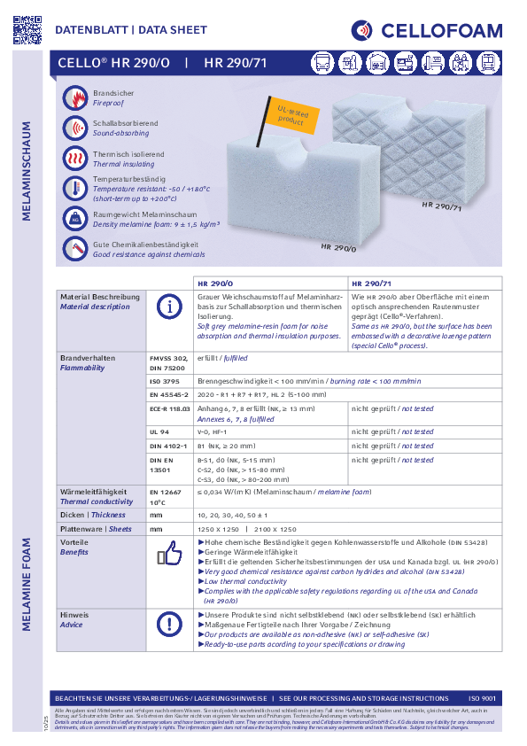 Hellgrauer Weichschaumstoff auf Melaminharzbasis (aus Basotect®) mit einer luftdurchlässigen und leicht verdichteten Oberfläche. Cello® HR 290/71 überzeugt durch sein optisch ansprechendes Rautenmuster sowie seiner hohen Temperaturbeständigkeit