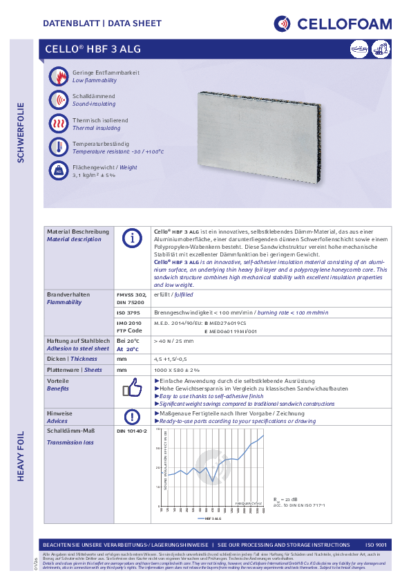 Cello® HBF 3 ALG ist ein innovatives, selbstklebendes Dämm-Material, das aus einer Aluminiumoberfläche, einer darunterliegenden dünnen Schwerfolienschicht sowie einem Polypropylen-Wabenkern besteht. Diese Sandwichstruktur vereint hohe mechanische Stabilität mit exzellenter Dämmfunktion bei geringem Gewicht.Produktdetails